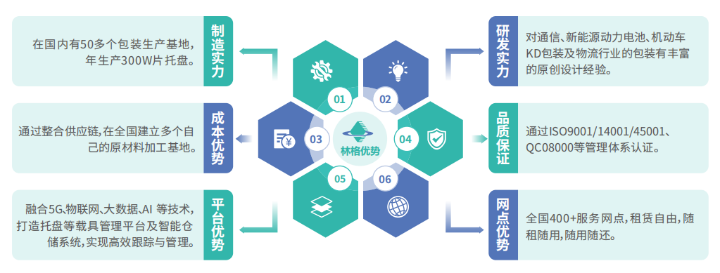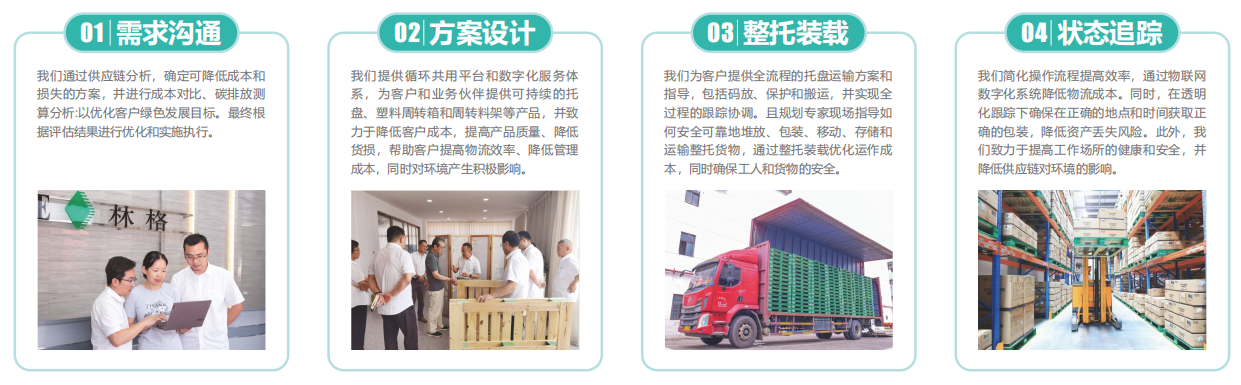 林格科技集团以“绿色、低碳、循环、智能”为核心理念,充分发挥先进技术和管理理念的优势,实现对资源的有效利用和回收。共享托盘的成立旨在帮助客户量身定做符合其具体需求的方案,针对每个解决方案,我们都会阐述如何改进您的供应链模式,分享因此带来的财务收益,并与您的员工分享和共同探讨如何执行新流程和新程序。
